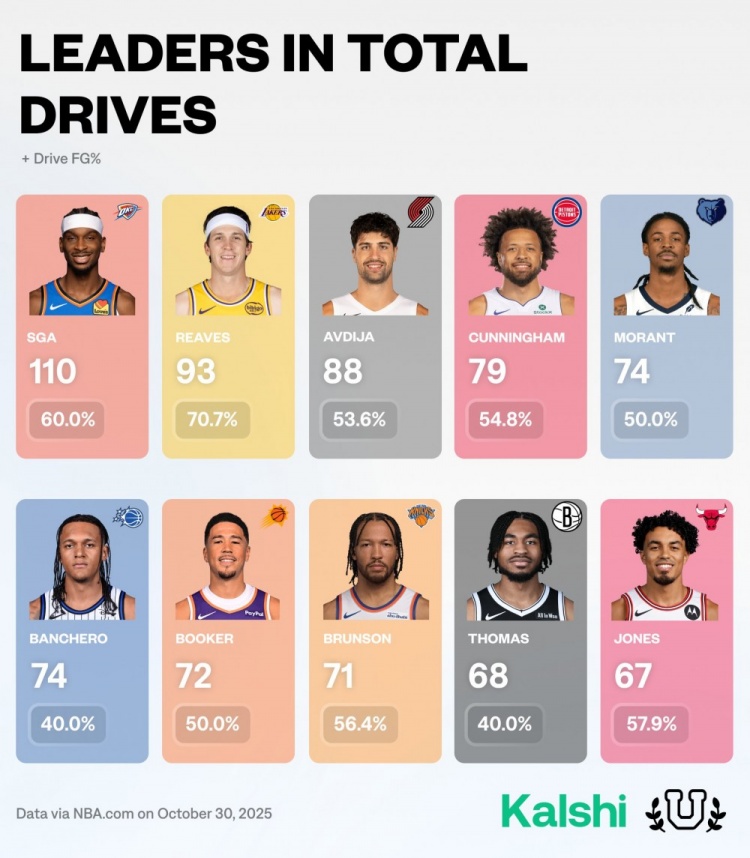 Data media NBA University reported that so far this season, Alexander has made a total of 110 breakthroughs, making him the player with the most breakthroughs in the entire NBA. Among the top ten, Reeves has the highest shooting percentage after a breakthrough, with a shooting percentage of 70.7%.