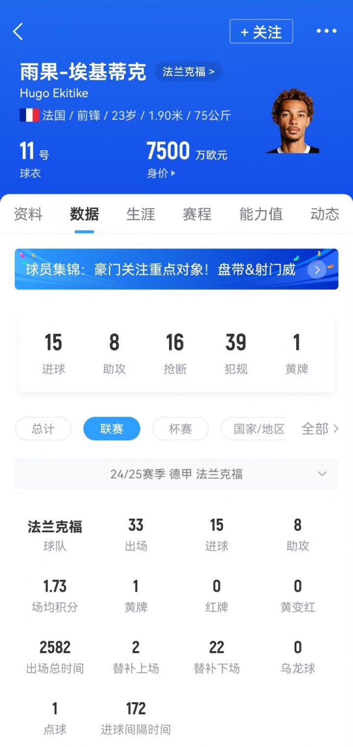 Ekitic made 33 appearances in the Bundesliga for Frankfurt last season, contributing 15 goals and 8 assists. The current German turnover price is 75 million euros.