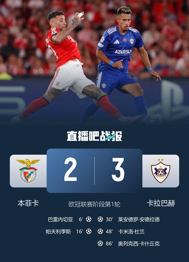 Upset! Benfica missed a good start 2-3. Karabach made a second-chasing three-chasing round