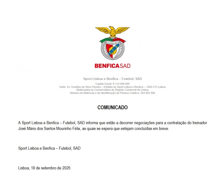 Benfica Sports Football Co., Ltd. has informed the Portuguese Securities Market Committee that negotiations on the appointment of coach Mourinho are in progress and the signing is expected to be completed soon.