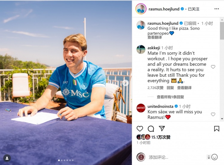 Hoylen posted a photo of wearing a Naples jersey and smiling, with the caption: "Fortunately, I like pizza, I am from Naples."